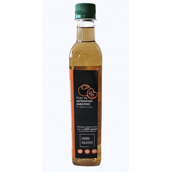 Органски оцет од јапонско јаболко, произведен од 100% овошје од сопствена фарма. Природно ферментиран. 5 години стар.